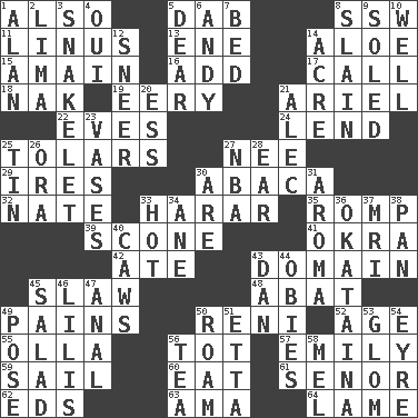 ACROSS 1. In addition 5. Apply (a substance) by light strokes 8. Compass dir. 11. "_ and Lucy" (Charlie Brown theme song) 13. Compass dir. 14. Medicinal plant 15. At full speed 16. Say or write further 17. Give a ring to 18. A female yak 19. Suggestive of the supernatural 21. Satellite of Uranus 22. Nights before holidays 24. Grant temporary use of 25. Monetary units of Slovenia 27. Born 29. Angers 30. Phillipine bananalike plant 32. Nathan's nickname 33. Ethiopian city, capital of Harari 35. Frolic 39. Biscuitlike quick bread 41. Gumbo ingredient 42. Had dinner 43. Realm 45. Cole _ (cabbage dish) 48. Blind as ____ 49. Aches 50. Painter Guido (1575-1642) 52. Personal question 55. Rounded earthenware pot or jar 56. Small child 57. Poet Dickinson 59. Move on water 60. Erode 61. Sir (Sp.) 62. Begley and Asner 63. Housemaid (var.) 64. Unable to walk DOWN 1. Actor Alda or Thicke 2. Pale green bean 3. A young snake 4. Fr. "Yes" 5. Letter starter 6. Actor Griffith 7. A group of snakes 8. Killed 9. Having a sole or soles 10. Water source 12. Scornful expression 14. 43,560 square feet 20. Curvy letter 21. Actor Baldwin 23. Flower holders 25. Shallow baking pan 26. Mouth or opening 27. Basketball assoc. 28. Hearing organ 30. "We ___ not amused" (Victoria) 31. Scent 33. Being at a high temperature 34. A saturated hydrocarbon 36. Volcano in North Island 37. Medical imaging device (abbr.) 38. Baking dish 40. Crow sounds 43. Daniel's nick name 44. Off-Broadway awards 45. Vegetable dish 46. Ms. Damita and namesakes 47. Of or related to the anus 49. Introduce or present, as a question 50. Wander aimlessly 51. Singer James 53. Seize upon or latch onto something 54. Jane of fiction 56. Afternoon social gathering 58. Cartoonist voice _ Blanc