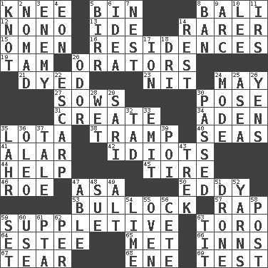 ACROSS 1. Leg joint 5. Storage container 8. Indonesian resort city 12. Words to Nanette 13. Binary compound 14. Less widely known 15. Presage 16. Dwellings 19. Scottish cap 20. Speakers 21. Colored 23. A young louse 24. Can I? 27. Sty mamas 30. Introduce or present, as a question 31. Make 34. Arabian gulf 35. Globular water bottle used in Asia 38. _____ steamer (cargo ship) 40. Oceans 41. Having or resembling wings 42. Foolish or stupid persons 44. Aid 45. Become fatigued 46. A female deer 47. White ___ sheet 50. Whirlpool 53. A young male cow 57. Reproach for some lapse or misdeed 59. Supplying deficiencies 63. "Corrida" creature 64. First name in cosmetics 65. Was introduced to 66. Taverns 67. Separate forcefully 68. Compass dir. 69. Trial DOWN 1. A group of eels 2. Roamer 3. Foe 4. A really long time 5. Monetary unit of Ethiopia 6. The content of cognition 7. Egg locale 8. Forbid 9. Curve 10. Area sheltered from the wind 11. Big collection agency 14. Take ten 17. Electrically charged atom 18. A female yak 20. Scent 22. Fortification 24. Method 25. Toward the sea 26. Monetary units of Japan 28. Soggy 29. Indian skirt 30. Went by 32. Small amount or degree 33. Send forth 35. Cowardly lion portrayer 36. Margarine 37. Lie 39. Luau course 43. Long journey 47. Competent 48. Institute legal proceedings 49. Keyboard modifier key 51. A male wasp 52. Tall tales 54. Citrus frut 55. Baking chamber 56. A group of badgers 58. Mail 59. Arrange properly for use 60. Purpose 61. Parent Teacher Association (abbr.) 62. For each 63. Teat (slang)