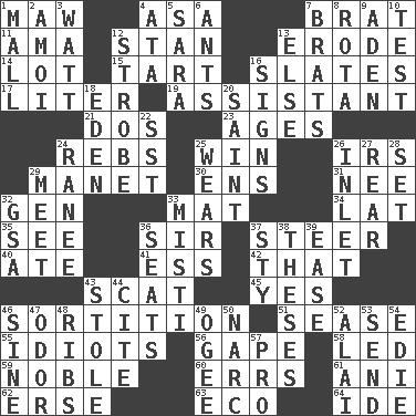 ACROSS 1. Opening into something insatiable 4. White ___ sheet 7. Naughty child 11. Wet nurse (var.) 12. Comedian Laurel of Laurel & Hardy 13. Wear away 14. Car dealer's back yard 15. Small pie 16. Chalkboards 17. 61 cubic inches 19. Helper 21. Two (Sp.) 23. Eras 24. Confederate soldiers (slang) 25. Acquire through effort 26. Big collection agency 29. French painter Edouard 30. Followers of ems 31. Born 32. Commissioned mil. rank 33. Floor covering 34. Monetary unit of Latvia 35. Perceive with the eye 36. Title for a knight 37. Navigate 40. Had dinner 41. Double-curved letter 42. Not this but _ 43. Scram, to a cat 45. Consenting reply 46. Decision 51. Gospel singer Marvin 55. Foolish or stupid persons 56. Open wide 58. Directed 59. Having high moral qualities 60. Blunders 61. Black tropical American cuckoo 62. Celtic language 63. Environmental prefix 64. Binary compound DOWN 1. Promenade 2. Mine, in Marseilles 3. Electrical Unit 4. "One Day ___ Time" 5. "Two Mules for Sister ____" 6. Pismires 7. Naughty children 8. Roll call or roster of names 9. An important port of Yemen 10. Trial 12. Disco prop 13. Otherwise 16. Public displays of written messages 18. Genesis locale 20. Virtuous person 22. Fast jet (abbr.) 24. The wife of a rajah (variant) 25. Puts on (as clothing) 26. An arm off of a larger body of water 27. Posterior 28. Put into a specified state 29. Rendezvous 32. Girls' org. (abbr.) 33. Volcano in Peru 36. Theater features 37. Filthy place 38. College papers 39. Relaxation 43. Took without asking 44. Quote 46. Trig term 47. Scent 48. Chest bones 49. Double curve, resembling the letter S 50. Drug cop 52. Jai ____ 53. Post 54. Singer Brickell 57. Adept person
