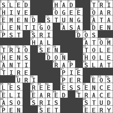 ACROSS 1. Downhill vehicle 5. Possessed 8. Three (prefix) 11. Hub of activity 12. Double curve, resembling the letter S 14. Rowing implement 15. Make improvements or corrections to 17. Feeling sharp psychological pain 18. _ moment's notice (2 wds.) 19. Small, flat, pigmented spot on the skin 21. White ___ sheet 22. Lair 23. Pacific Standard Time (abbr.) 24. _ Lanka 25. Two (Sp.) 27. Actor Linden 28. Smallest unit of an element 31. Musical group of three 35. Elected rep. 37. Lacquered or enameled metalware 38. Coop moms 39. Spanish title 41. Hollow 42. Against 43. Hit sharply and swiftly 45. Narrow board 46. Become fatigued 47. Sliced dessert 49. RI univ. 51. For each 52. Greek goddess of the dawn 55. French article 57. To separate or throw off 60. Core 62. Biblical high priest 63. Having ears or earlike features 65. A group of rabbits 66. Volcano in Japan 67. Indian titles of respect 68. A male horse 69. Animal enclosure 70. Arrange properly for use 71. Suggestive of the supernatural DOWN 1. A young lion 2. Citrus fruits 3. Happening 4. Undesirable depression on a surface 5. Being at a high temperature 6. Volcano in Guatemala 7. Habitations of wild animals 8. Inedible or poisonous agaric 9. Pace 10. SW Asia republic 13. Mild oath 16. Food container 17. Dirtied 20. Pate de foie ____ 26. Curses 29. Water jar 30. Rendezvous 31. Not this but _ 32. Painter Guido (1575-1642) 33. A group of cockroaches 34. Flexible twig of a willow tree 36. Not either 40. Slept 44. Sliced desserts 48. A group of bees 50. Angers 52. Maternal 53. Happen 54. Morally degraded 55. A group of leopards 56. Otherwise 58. Hearing organs 59. One of the Great Lakes 61. Celtic language 64. Eastern Standard Time (abbr.)