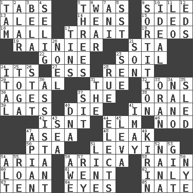 ACROSS 1. Bar bills 5. It was, poetically 9. Filth; sediment 13. Toward shelter 14. Coop moms 15. Wrote a lyric poem 16. Shopping center 17. Distinguishing feature 18. Vintage cars 19. Volcano in U.S.A. 21. R.R. building 22. Went 23. Earth 24. ___ a Wonderful Life 27. Curvy letter 28. Monthly bill 29. Add up to 31. Third day of the wk. 32. Charged particles 36. Ripens 37. A female animal or person 38. Taken by mouth 39. Monetary units of Latvia 40. Pass on 41. Empty; void 42. Is not 44. Shade tree 46. Allow head to fall sleepily 47. At sea 48. Path through which fluid escapes 50. Parent Teacher Association (abbr.) 51. Imposing or collecting, as a tax 54. Operatic vocal solo 56. N. Chile seaport 58. Precipitation 60. Grant temporary use of 61. Gone 62. In an inward manner 63. Portable shelter 64. Snake ____ (dice throw) 65. Nathan's nickname DOWN 1. Scottish cap 2. Having or resembling wings 3. Actor Lugosi 4. Former Milwaukee Brewers owner Bud 5. Threesomes 6. Put on (as clothing) 7. Cuckoo 8. Fast jet (abbr.) 9. Decision 10. Perfect 11. Lion 12. Begley and Asner 17. Metal containers 20. Christmas carol 21. Boy, to dad 23. Observe 24. Slanted text style (abbr.) 25. Ancient Roman robe 26. Proofreading order 28. Sorrow 30. Helper 31. Definite Article 33. NW Algerian seaport 34. Billionth: prefix 35. Downhill vehicle 37. Be seated 40. Heredity factor (abbr.) 41. "If ____ say so..." 43. Ocean 44. Opts 45. Monetary unit of Bulgaria 47. Bee-related 49. Japanese brewing company 51. Actor's bit 52. Grandmother 53. A female hog 54. Keyboard modifier key 55. A female deer 56. Deep reverence 57. Marina Del _, California 59. A group of oxes