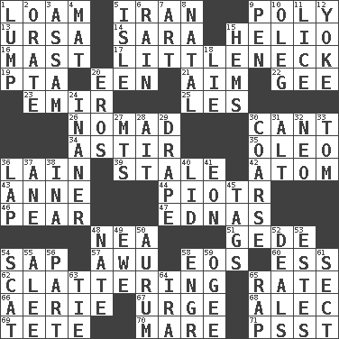 ACROSS 1. Rich soil 5. SW Asia republic 9. Much (prefix) 13. A female bear 14. "Two Mules for Sister ____" 15. Sun: prefix 16. Vertical spar for supporting sails 17. A young clam 19. Parent Teacher Assoc. 20. Car or cant ending 21. Direct toward a target or goal 22. Unit of force equal to gravity 23. Independent ruler or chieftain 25. French article 26. Roamer 30. Patter 34. Moving about 35. Butter sub 36. (Had) reclined 39. Having lost freshness 42. Tiny particle 43. Singer Murray 44. Peter (Polish) 46. Lightbulb-shaped fruit 47. Ferber et al. 48. Teachers' org. 51. Volcano in Java 54. Plant excrement 57. Volcano in Pulau Sangihe 58. Greek goddess of the dawn 60. Curvy letter 62. A group of choughs 65. Assign a rank or rating to 66. Nest on high 67. Goad 68. Actor Baldwin 69. Wig 70. Female horse 71. Inconspicuous attention getter DOWN 1. Mass 2. Declaim 3. Indian state 4. Floor protector 5. Capri or Wight 6. Precipitation 7. Tate display 8. Relating to or accompanying birth 9. Writing instrument 10. Cassini of fashion 11. Louse (plural) 12. A group of oxes 15. Equivocates 18. Untruth 20. Greek god of love 24. More lacking in sense or substance 27. Mountains (abbr.) 28. Small island 29. Window treatment 30. Unrefined 31. The first octave above the treble staff 32. Modern: prefix 33. A male domestic cat 36. Pet locale 37. One (Scot) 38. _ tizzy (2 wds.) 40. Flaplike covering 41. Period of immesurable duration 45. Labels 48. Nathan's nickname 49. She-sheep 50. Gold (Symbol: Au) 52. Allots cards 53. _____ Park, CO 54. Get outta here! 55. Toward shelter 56. Component 58. Engineer (abbr.) 59. Double curve, resembling the letter S 61. Religious group 63. Make a knot 64. Lyricist Gershwin 65. Strike