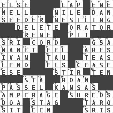 ACROSS 1. Otherwise 5. Pet locale 8. Compass dir. 11. 1994 drama film starring Jodie Foster 12. Mediterranean tributary 13. One of the 12 tribes of Israel 14. Sowing specialist 17. A young squirrel 19. Erase 21. Speaker 22. French philosopher Descartes 23. A group of snakes 24. _ Lanka 27. Drawstring 29. Girls' org. (abbr.) 32. French painter Edouard 34. Snakelike fish 36. Ancient Greek god of war 37. "Terrible" tsar 38. The 19th letter of the Greek alphabet 39. Afternoon social gatherings 40. Grant temporary use of 41. Raised railways 42. Stop 43. Compass dir. 44. Commotion 46. Nine, plus one 47. R.R. building 50. Wander aimlessly 52. A group of possums 55. Sunflower state 57. Electrical Measurement 59. Fragments 62. ___ good deed 63. A male deer 64. Pacific island yam 65. Be seated 66. Car or cant ending 67. Indian titles of respect DOWN 1. Followers of ems 2. Area sheltered from the wind 3. Downhill vehicle 4. A person who is older than you are 5. Untruth 6. Columnist Joseph or Stewart 7. _ dish (used to culture cells) 8. Prepare for publication 9. Billionth: prefix 10. Engineer (abbr.) 12. Compass dir. 15. Voters do this 16. Former U.S. Attorney General Janet 18. Monetary unit of Latvia 20. Cylindrical with tapered ends 24. Grin 25. All-night dance parties 26. Silly 28. Allots cards 29. Relatively large 30. Gospel singer Marvin 31. NE Netherlands city 33. Conclude 35. A period of five years 36. Had dinner 42. A group of rhinoceroses 45. Charged atoms 47. Compass dir. 48. Laconic 49. Having winglike extensions 51. Shops 52. Groovy apts. 53. Mine, in Marseilles 54. Petty quarrel 55. Cask 56. Shrivel 58. Separate the seeds from cotton 60. A female yak 61. Mayday