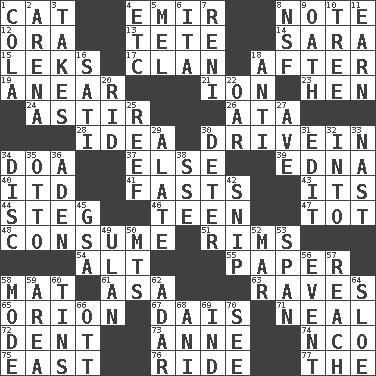 ACROSS 1. Feline 4. Arab leader 8. Brief written record 12. Mouth or opening 13. False hair 14. "Two Mules for Sister ____" 15. Monetary units of Albania 17. A group of hyenas 18. Following 19. Approach 21. Electrically charged atom 23. Layer 24. Being in motion 26. _ moment's notice (2 wds.) 28. The main thing one is thinking about 30. Popular '50s hangout 34. ___ good deed 37. Otherwise 39. Pulitzer Prize-winning author Ferber 40. It would 41. Goes without food and/or water 43. ___ a Wonderful Life 44. A male goose 46. Adolescent 47. Small child 48. Eat 51. Basketball hoops 54. Keyboard modifier key 55. Some stationery 58. Floor covering 61. White ___ sheet 63. All-night dance parties 65. Greek mythologigal hunter 67. Raised platform 71. Anneal 72. Gouge 73. Singer Murray 74. Non-commissioned officer (abbr.) 75. 90 degrees 76. Travel on an animal 77. Definite Article DOWN 1. Root beer relative 2. Sports stadium 3. Proceeds 4. And so on (abbr.) 5. Cartoonist voice _ Blanc 6. Call ___ day 7. Painter Guido (1575-1642) 8. Science/research agcy. 9. Pledge 10. Family _ (genealogy) 11. Merit 16. Suttee (variant) 18. Against 20. To free from 22. Boat paddle 25. Coral ridge 27. "___ Maria" 29. Having winglike extensions 30. Prevent from occurring 31. Prepare for publication 32. To the inside or interior of 33. Political cartoonist Thomas 34. Compact _ 35. "Beetle Bailey" pooch 36. Arabian gulf 38. Compass dir. 42. Sever or remove by pinching or nipping 45. Girls' org. (abbr.) 49. ____ Bator 50. Mountains (abbr.) 52. Impair 53. Connect, as a bridge 56. Incident 57. Arrive at 58. Method 59. Type of rug 60. Airtight sealed metal containers 62. The sixth month of the Jewish calendar 64. A type of plum 66. Baseball player Mel 68. Cuckoo 69. Working for oneself (abbr.) 70. Observe